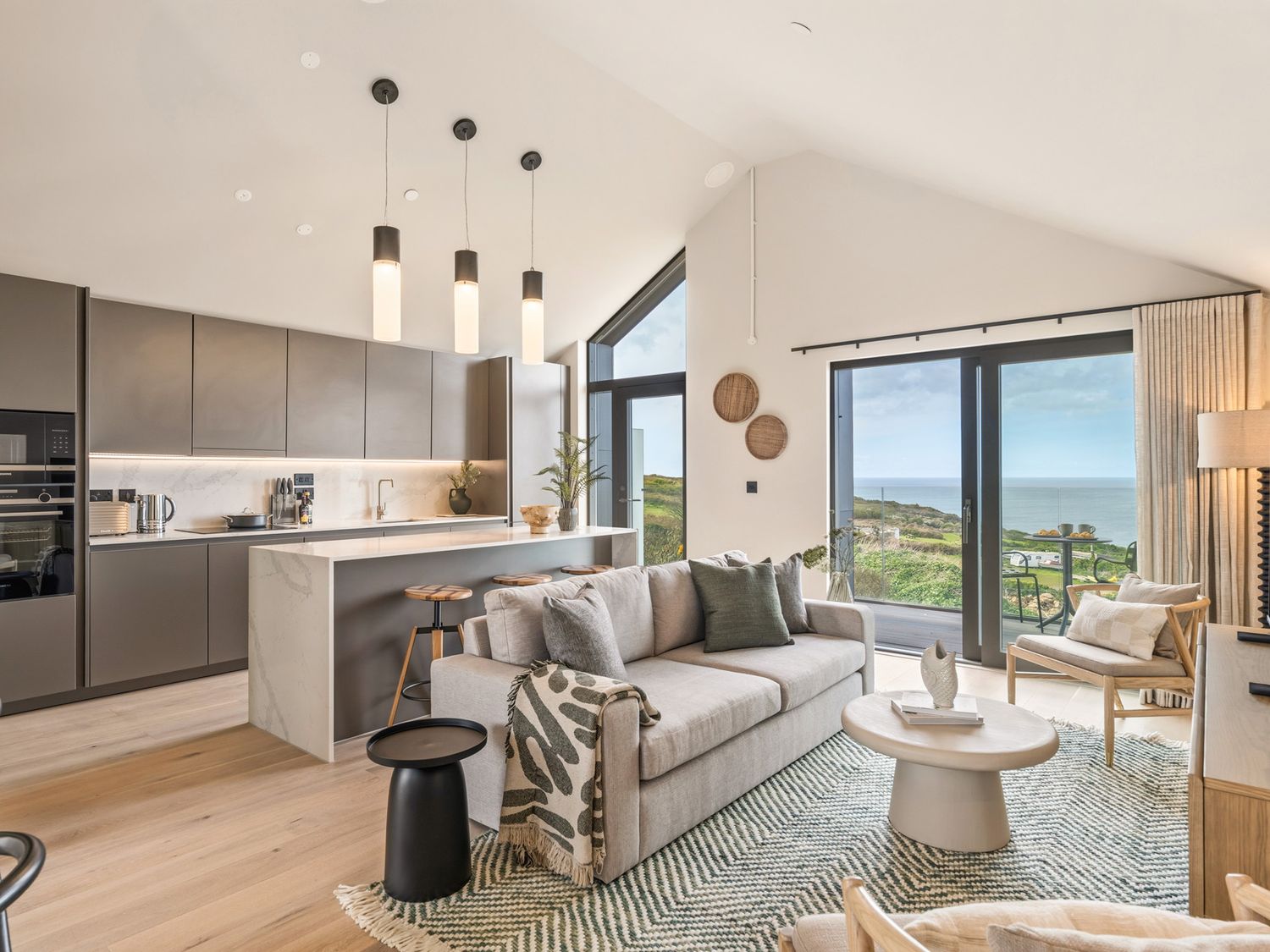 Upstairs, the open-plan living area brings everyone together, with a well-equipped kitchen, dining area, and sitting space that flows naturally onto a balcony overlooking the coast.