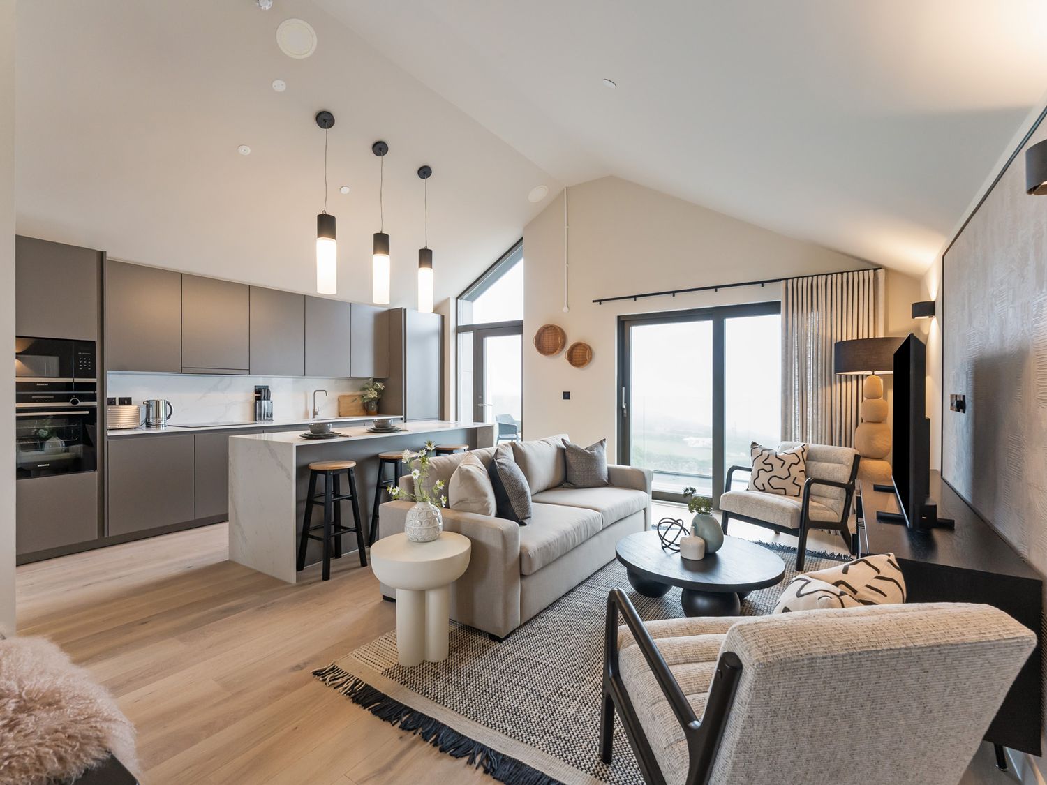• Open-plan living space with kitchen, dining area, and sitting area with balcony